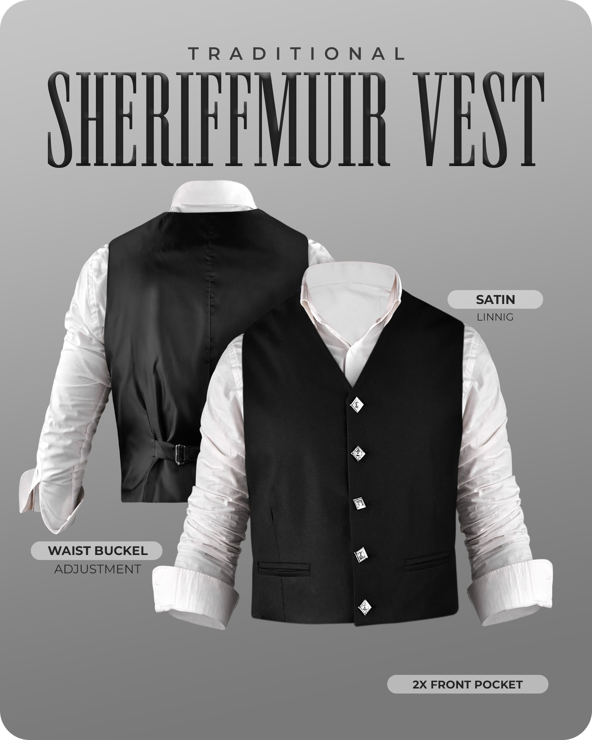 Elevate your Highland formalwear with timeless elegance. The Black Sheriffmuir Vest by Highland Redstone is a classic kilt vest tailored for sophistication and tradition. Whether worn as part of a full Black Sheriffmuir Jacket outfit or styled solo with your favorite kilt, this waistcoat completes the look with grace and heritage.