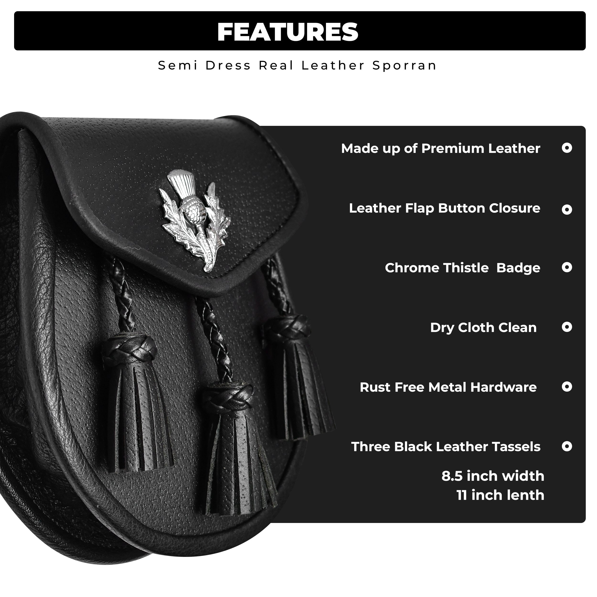 Semi Dress Leather Sporran w/ Thistle Badge I Black Plain