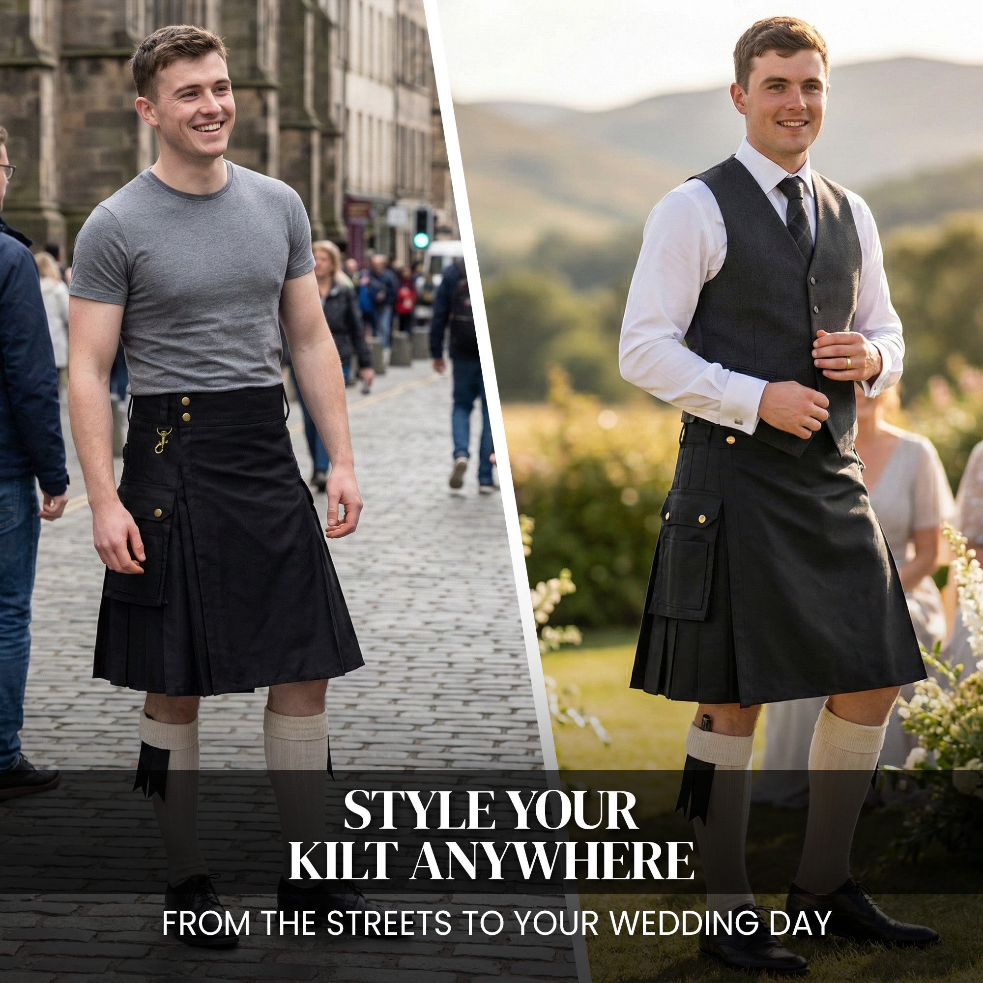 Upgrade your wardrobe with thePhantom Modern Black Utility Kilt, a perfect fusion of Scottish heritage, rugged functionality, and modern style. Designed for outdoor activities, workouts, festivals, and casual fashion, this men's utility kilt offers superior comfort, durability, and versatility.