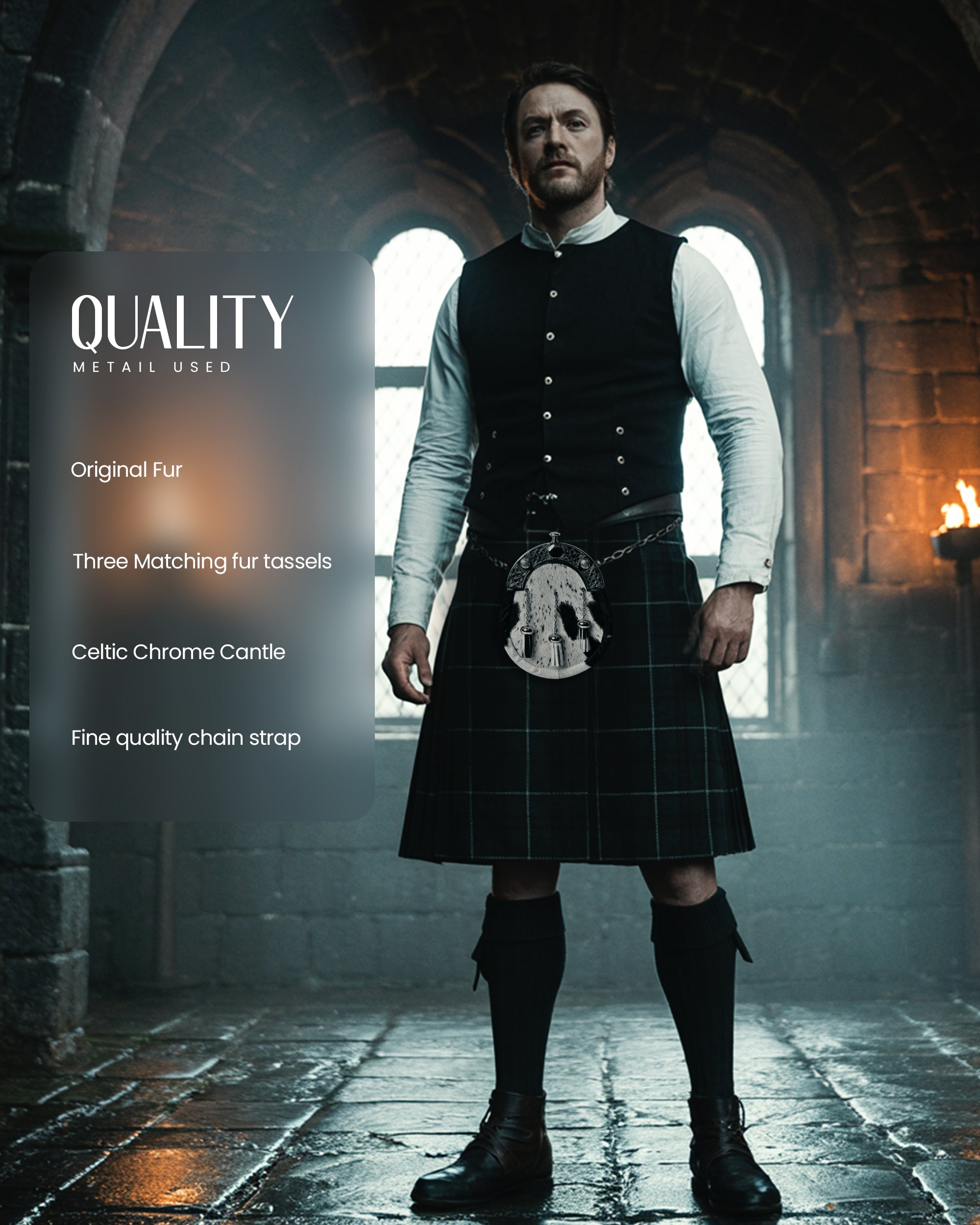 • The entire outfit Black chain-hung sporran with a chrome Celtic cantle bunny kilt