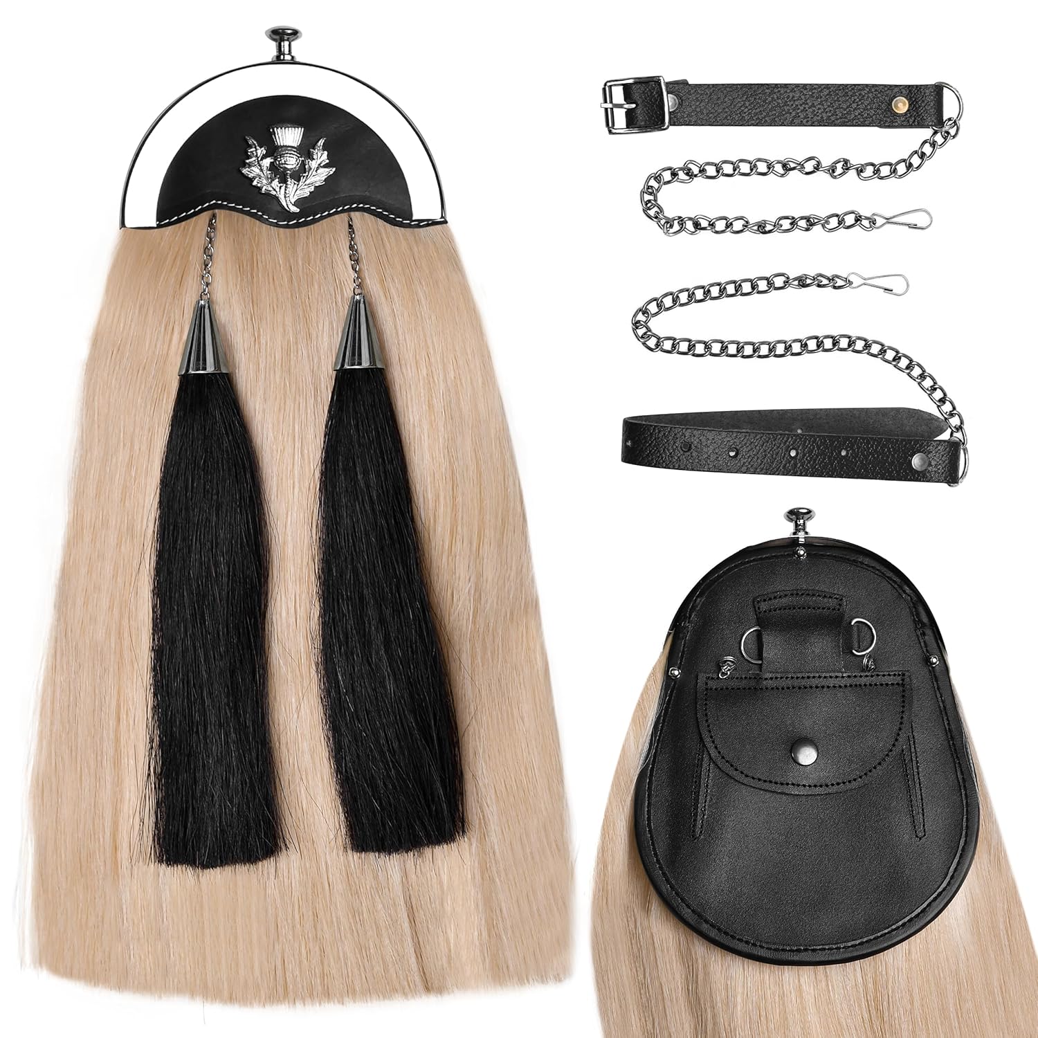 Complete your ceremonial Highland outfit with our Full Dress Horse Hair Sporran with Thistle Chrome Cantle, a premium Pipers Pride Sporran designed for pipe band performances, weddings, and formal Scottish events. This elegant piece reflects tradition, craftsmanship, and bold Highland character.