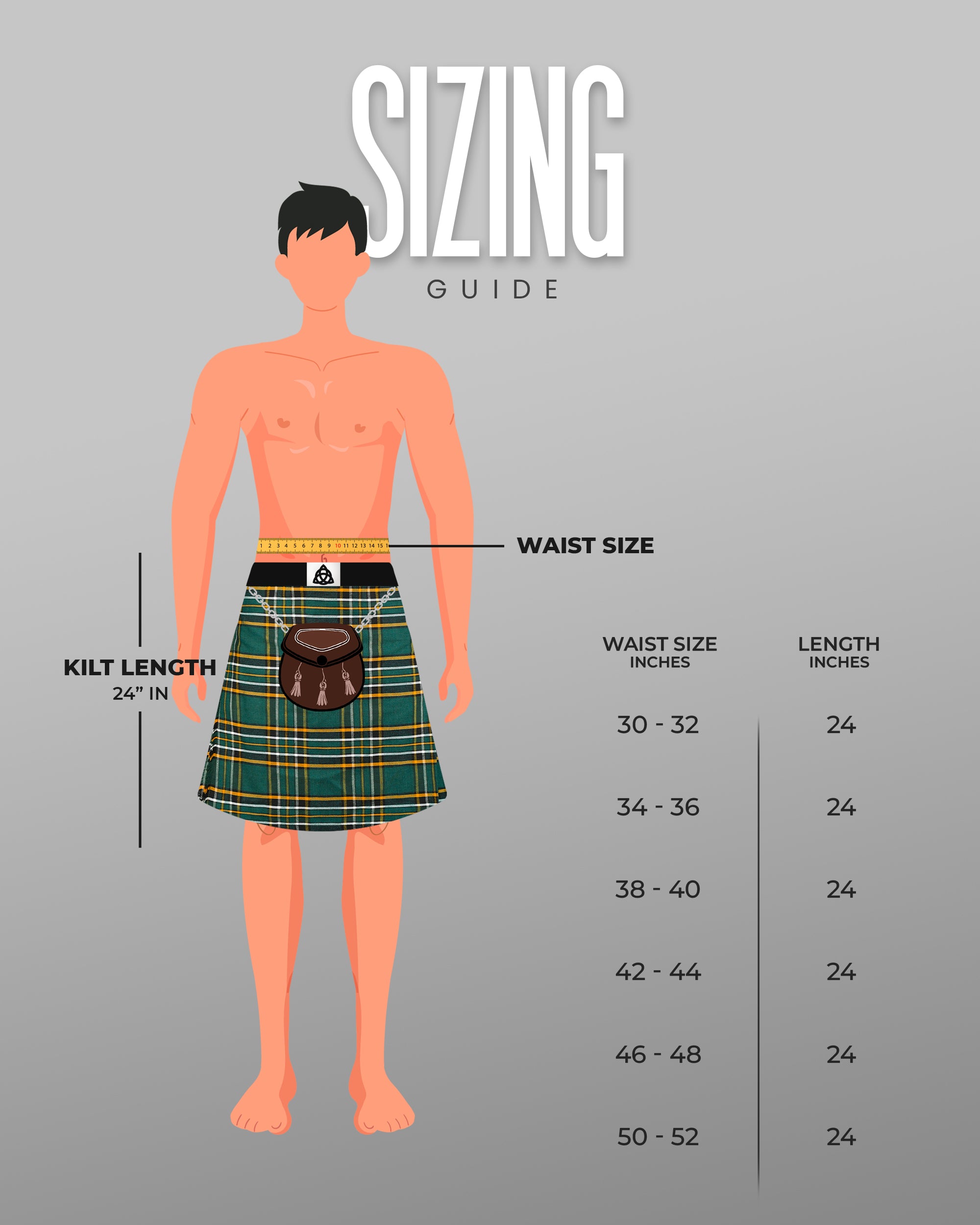 For the perfect fit, measure your kilt size at the level of your belly buttonkilt sizing differs from standard trouser sizes. The standard kilt length is 24 inches, ensuring a traditional and elegant drape. Please note that your pant size is not your kilt size. Our three-snap closureprovides a flexible and adjustable fit.