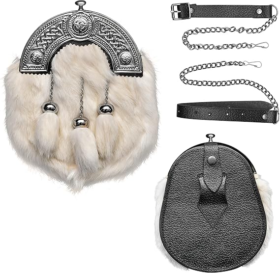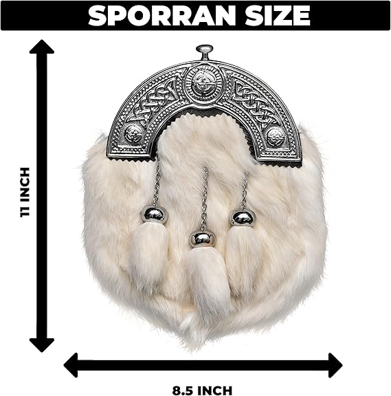Add timeless elegance to your Highland outfit with this Formal White Rabbit Fur Sporran, designed to complement traditional kilts. Crafted from luxuriously soft white rabbit fur, it delivers a refined appearance with lasting durability. The Celtic Dara cantle adds a classic full dress touch, making it ideal for formal wear.
