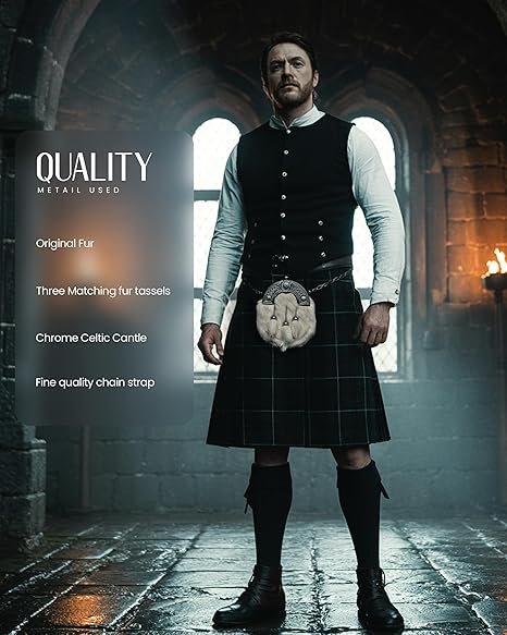 Designed for both style and practicality, this sporran features a spacious pouch for essentials and three matching fur tassels with polished metal detailing. An adjustable chain belt and leather strap ensure a secure and comfortable fit.