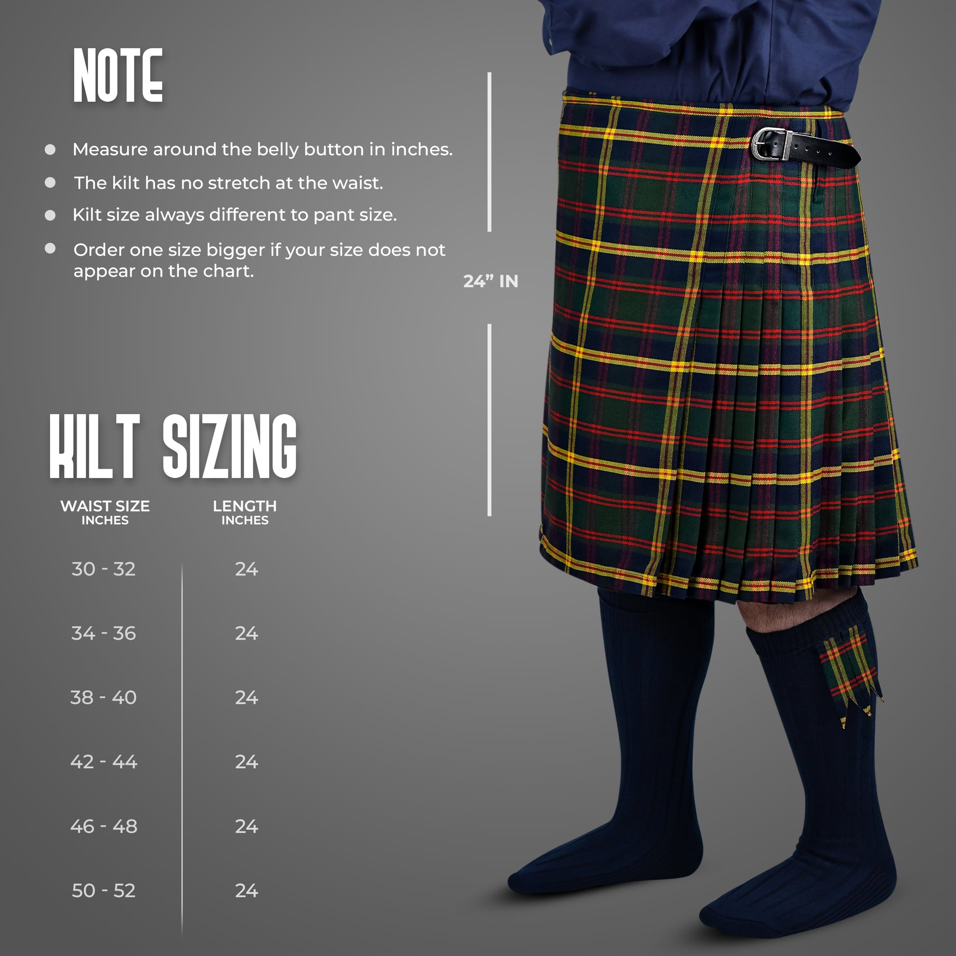 For the perfect fit, measure your kilt size at the level of your belly button—kilt sizing differs from standard trouser sizes. The standard kilt length is 24 inches, ensuring a traditional and elegant drape. Please note that your pant size is not your kilt size. Our three-snap closure provides a flexible and adjustable fit.